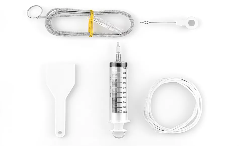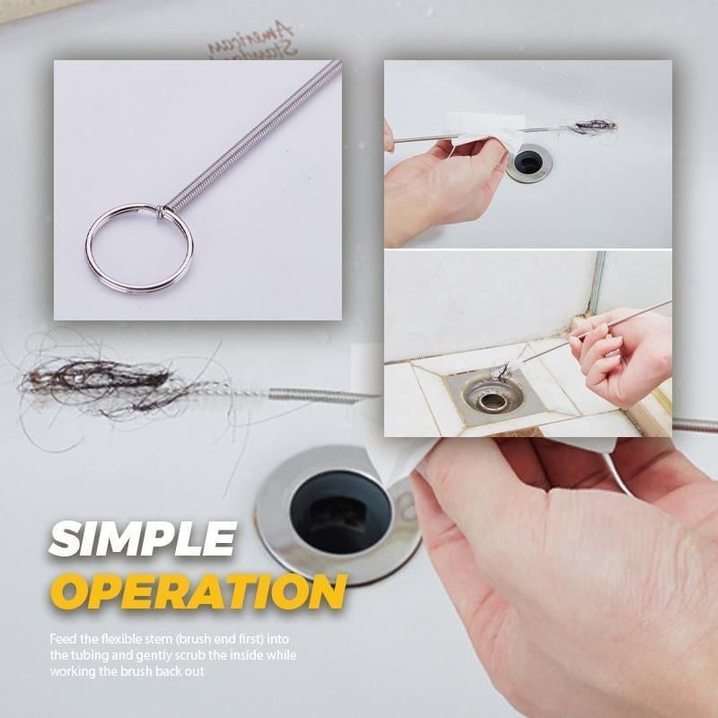 Introducir el vástago flexible (primero el extremo del cepillo) en el tubo y fregar suavemente el interior mientras se retira el cepillo. A continuación, introduzca el enchufe oblicuo del tubo en el orificio de desagüe. Inyecte agua caliente (158-176℉)para expulsar la obstrucción del desagüe. Si encuentra obstáculos al insertar el tubo, debe seguir impulsando agua caliente para derretir el hielo.
