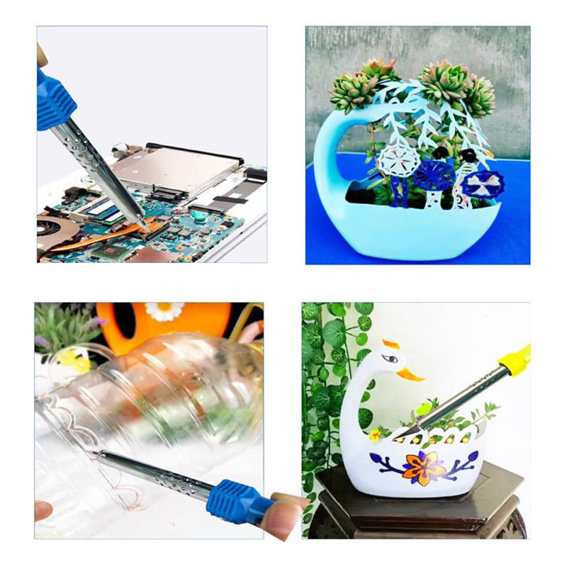 SET DE GRABADO CON SOLDADOR - El set incluye: 5 cuchillas reemplazables, 1 destornillador, 2 portapiezas y 1 enchufe de diferentes especificaciones. Este kit de soldadura para productos electrónicos ligero es portátil, fácil de usar o transportar, solo conecta y usa.