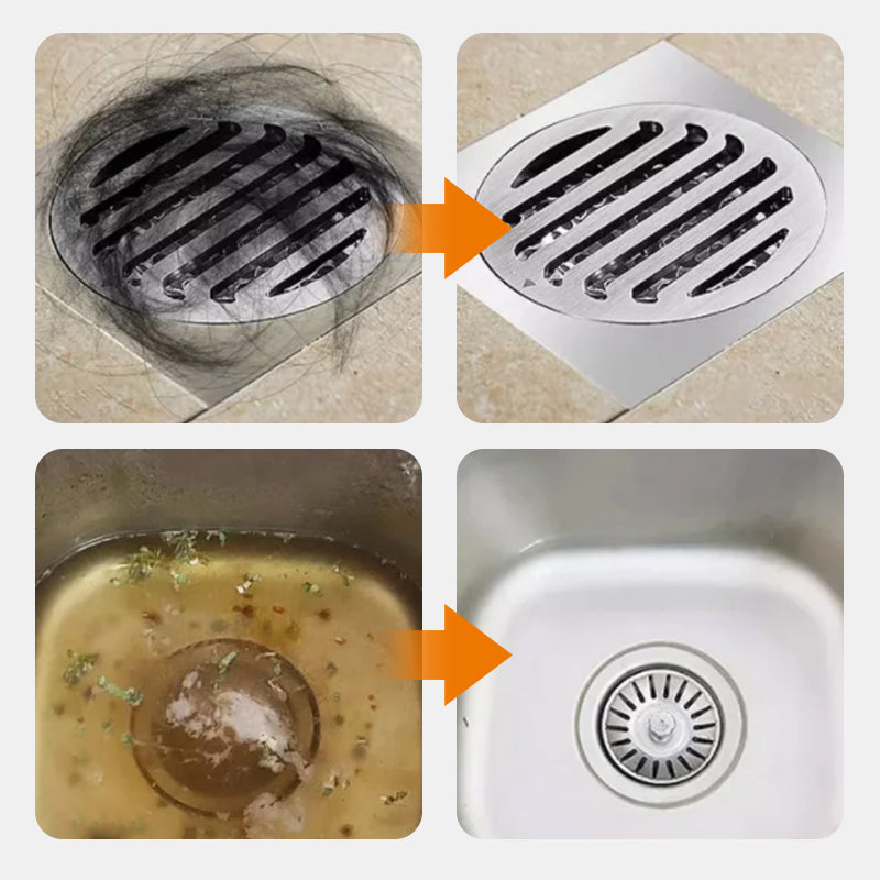 MULTIUSOS - Este producto puede usarse para despejar pelo obstruido en desagües de baño, lavabos y bañeras, papel higiénico obstruido y restos de comida obstruidos en el fregadero de la cocina. Es adecuado para varios materiales de tuberías, como tuberías de hierro fundido, tuberías de acero inoxidable y tuberías de PVC, pero no es adecuado para tuberías de aluminio, tuberías de plástico, tuberías con conexiones de cinta adhesiva, ni para manejar obstrucciones metálicas como clavos, joyas de metal, etc.